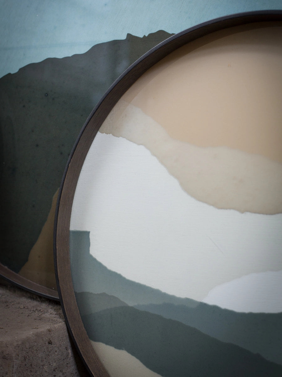 • Product Materials: Hand painted base - silk-screen printed glass - wooden rim