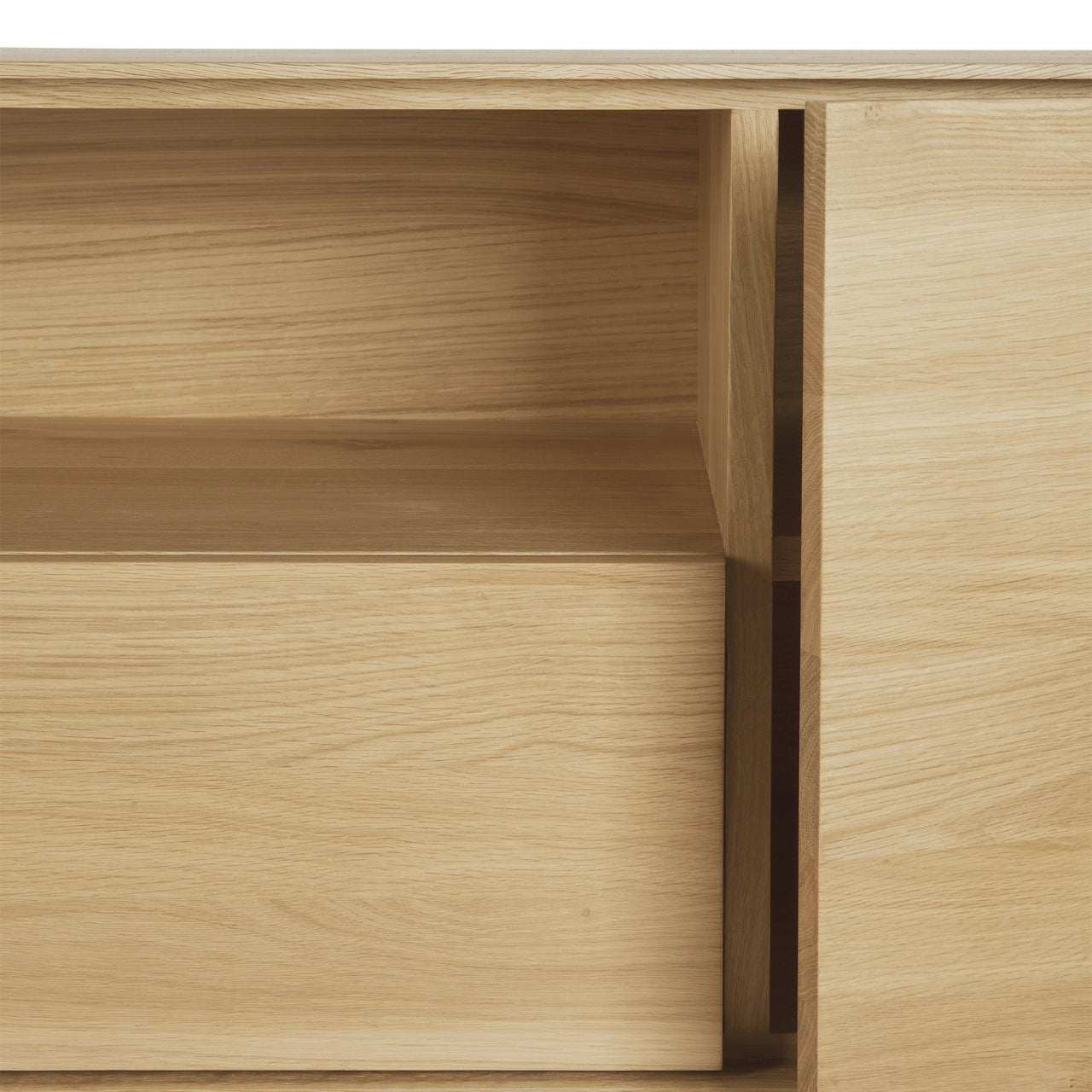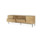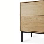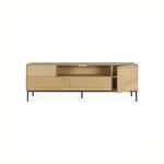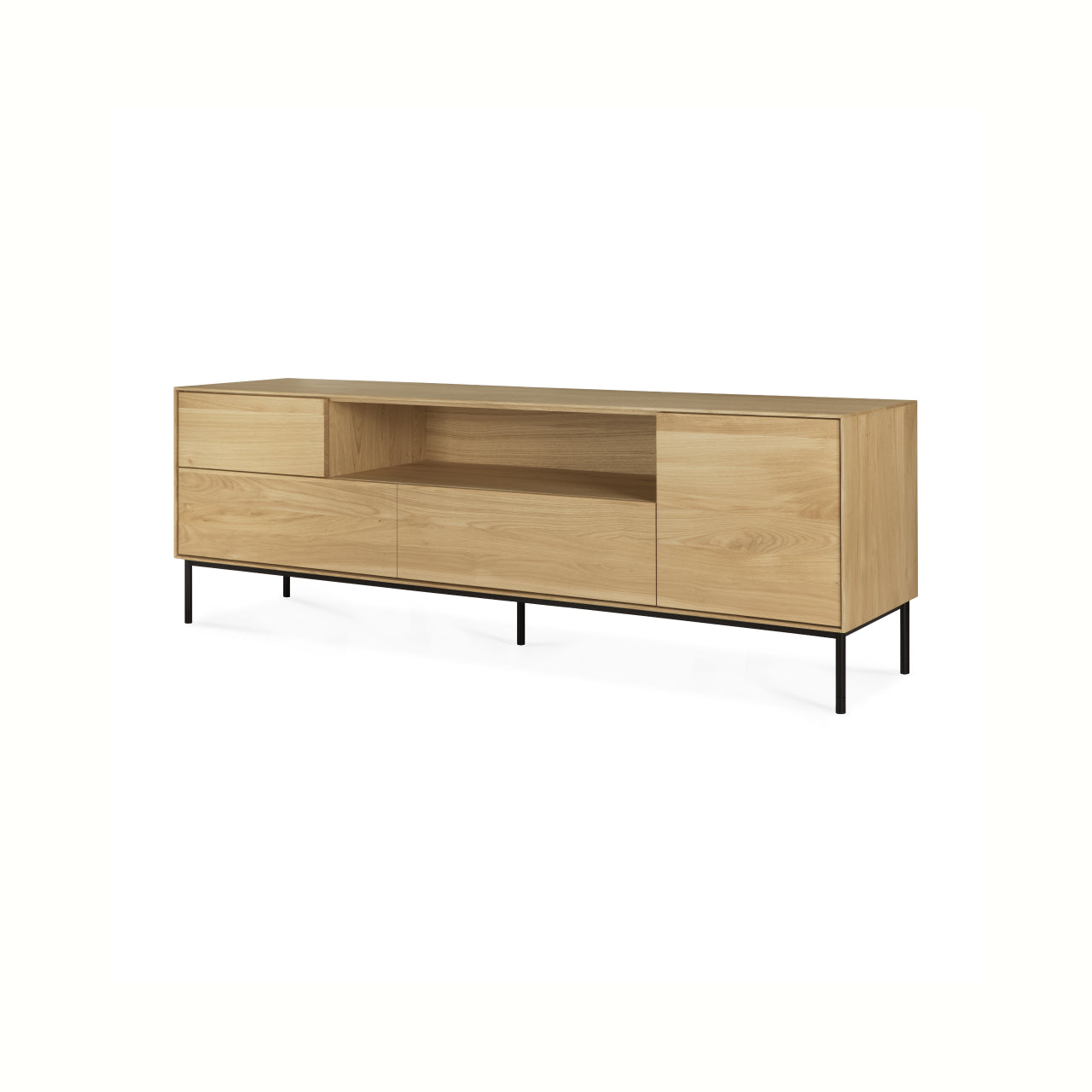 Crafted from solid European oak with a protective varnish and supported by slim black metal legs, the Whitebird TV Cupboard by Ethnicraft combines natural warmth with architectural restraint. Thoughtfully designed compartments organize media equipment and accessories while maintaining the calm, minimalist aesthetic of Scandinavian design.